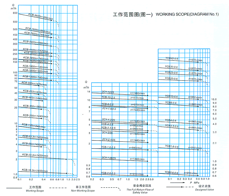 各型齒輪泵性能參數(shù)中給出的排出壓力是給出的工作壓力值大,在此范圍內(nèi)泵均能正常工作,其工作范圍見圖一。